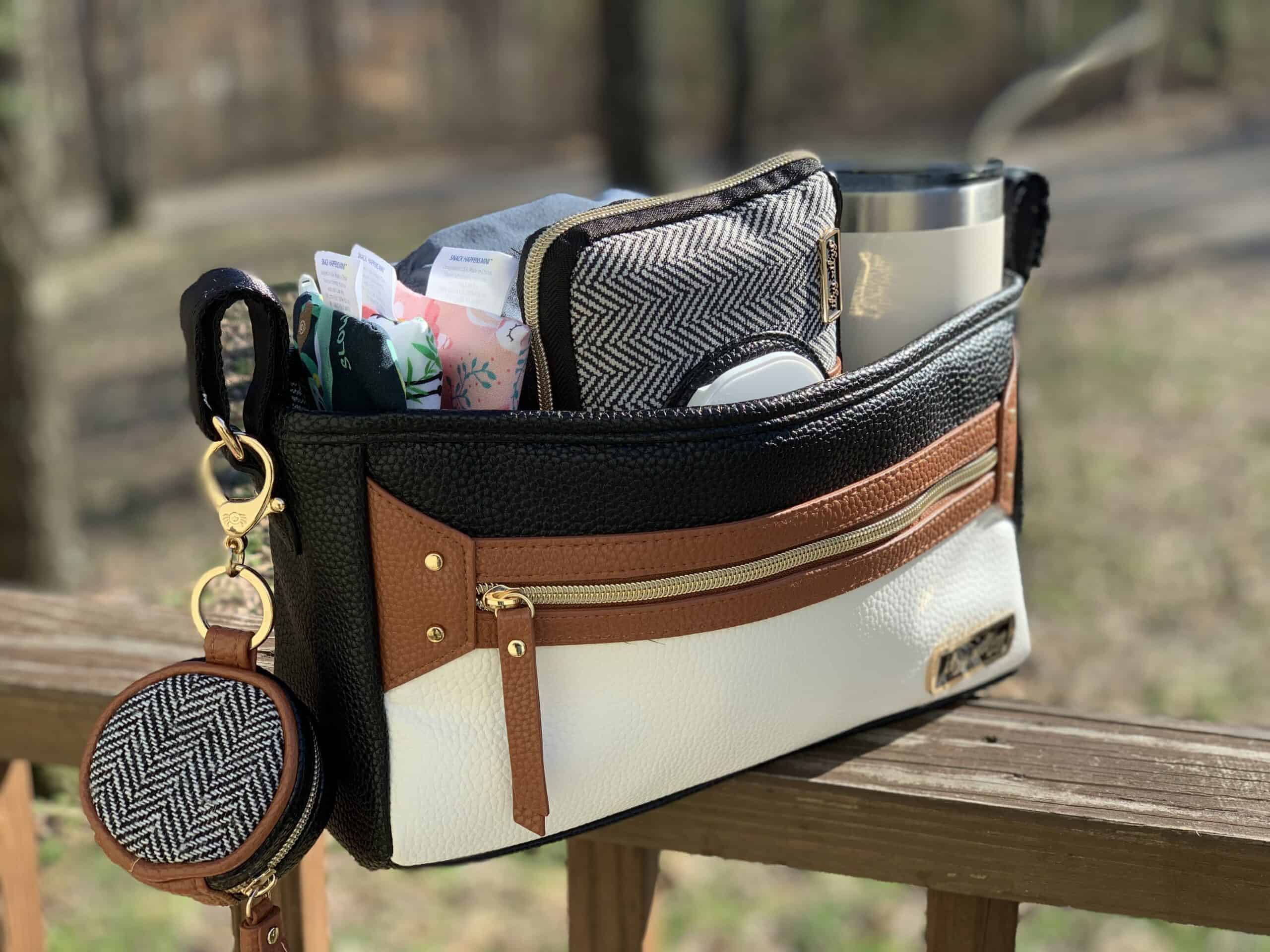 Our stroller caddy easily attaches to the handle of your stroller, and its adjustable straps allow it to fit most strollers!