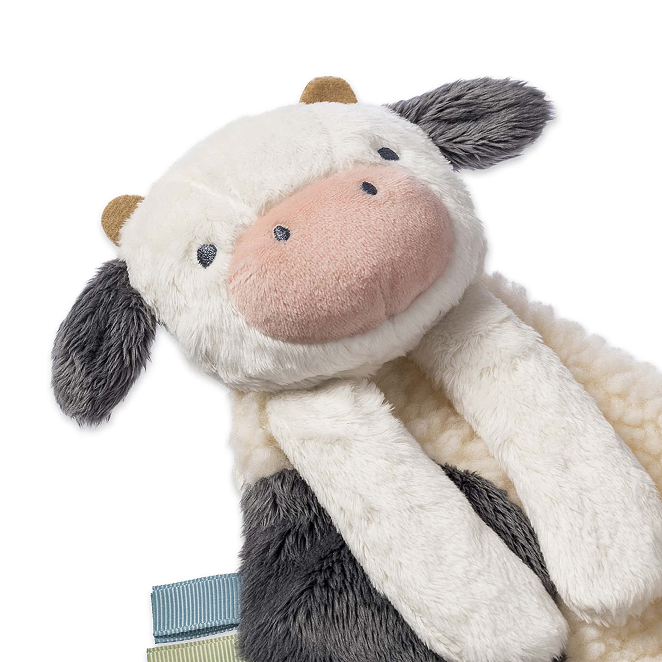 The adorable cow lovey features soft Sherpa fabric to provide comfort and security and its gentle crinkle sound will help keep baby entertained. Baby will also love exploring the attached textured ribbons!