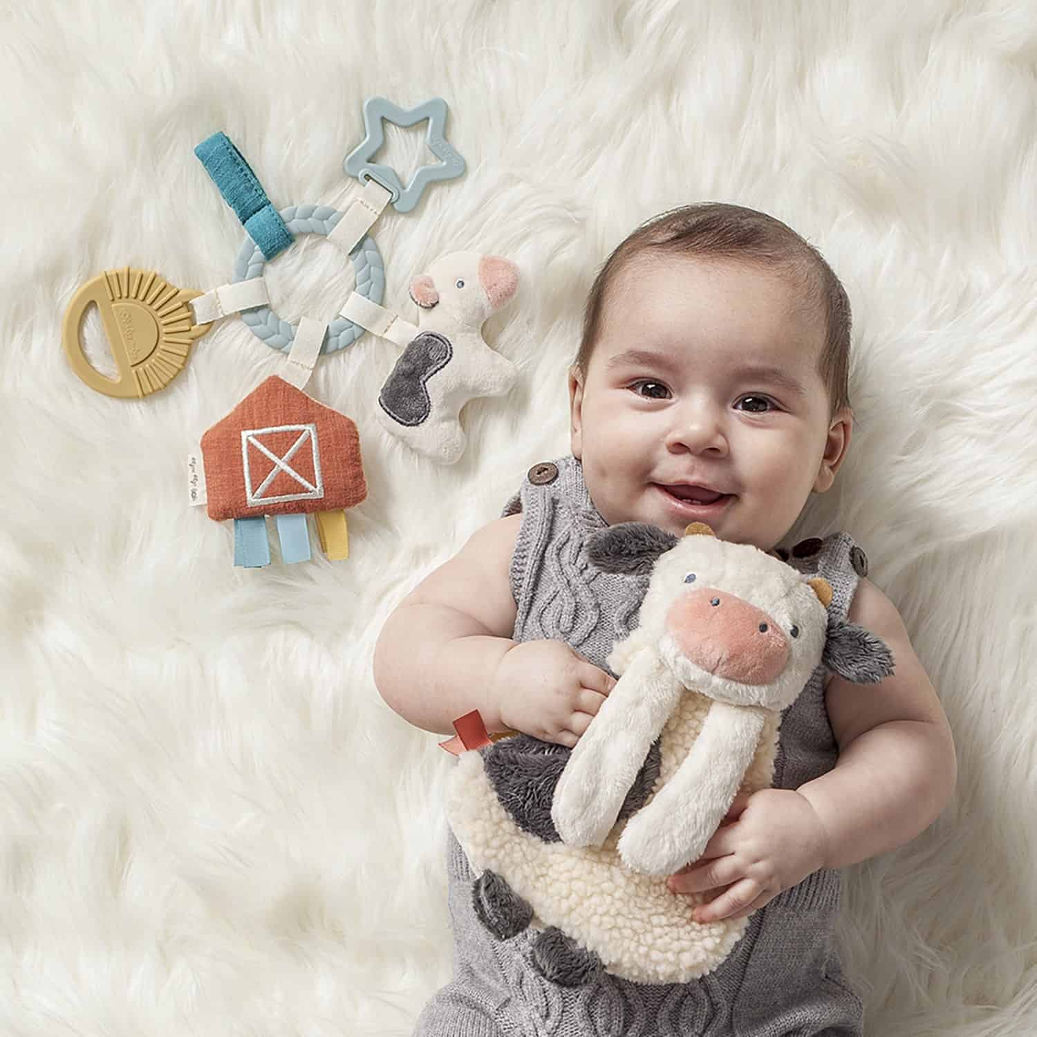 - Gift set includes a cow lovey and a farm-themed Bitzy Busy Ring
