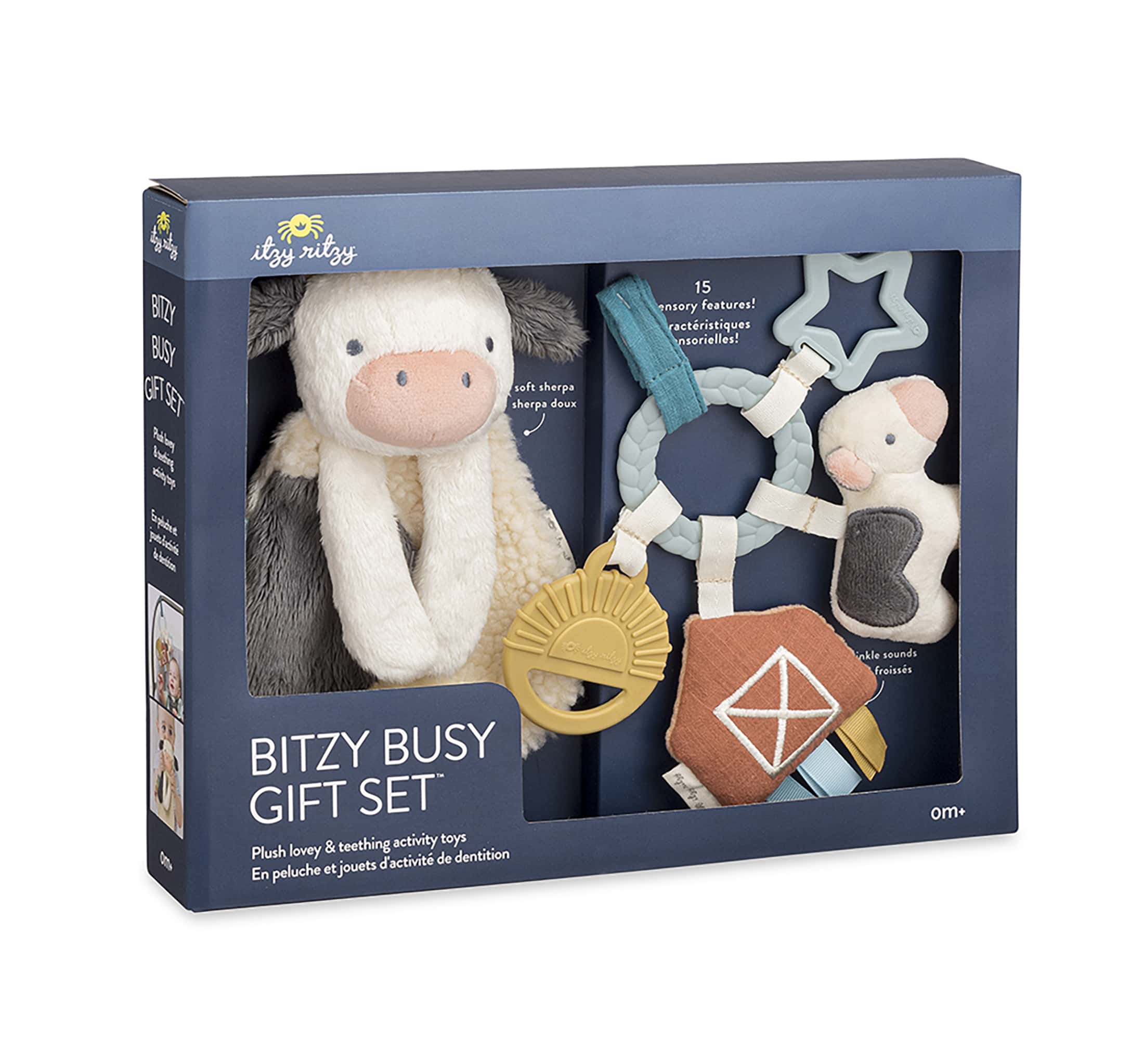- Perfect for gifting! Our Bitzy Busy Gift Set includes a cow lovey and a coordinating Bitzy Busy Ring