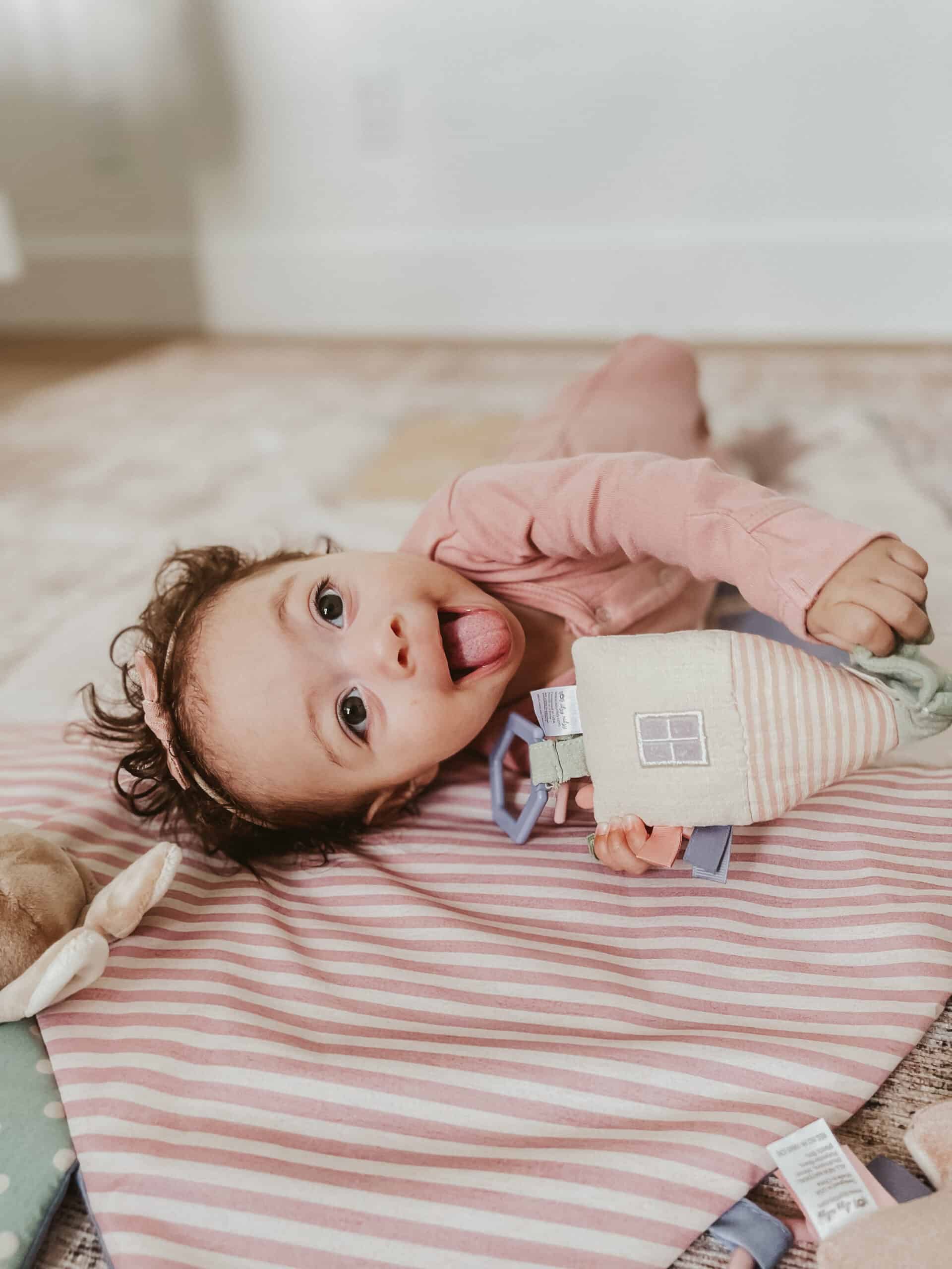 The tummy time mat includes a bolster, mirror toy and a crinkle toy!